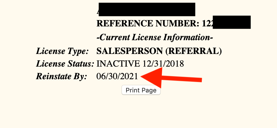Next write down your “Reinstate by” date. This is when your license actually expires (i.e. after this date you would be required to take the 75 hour course to become an active real estate agent again).
